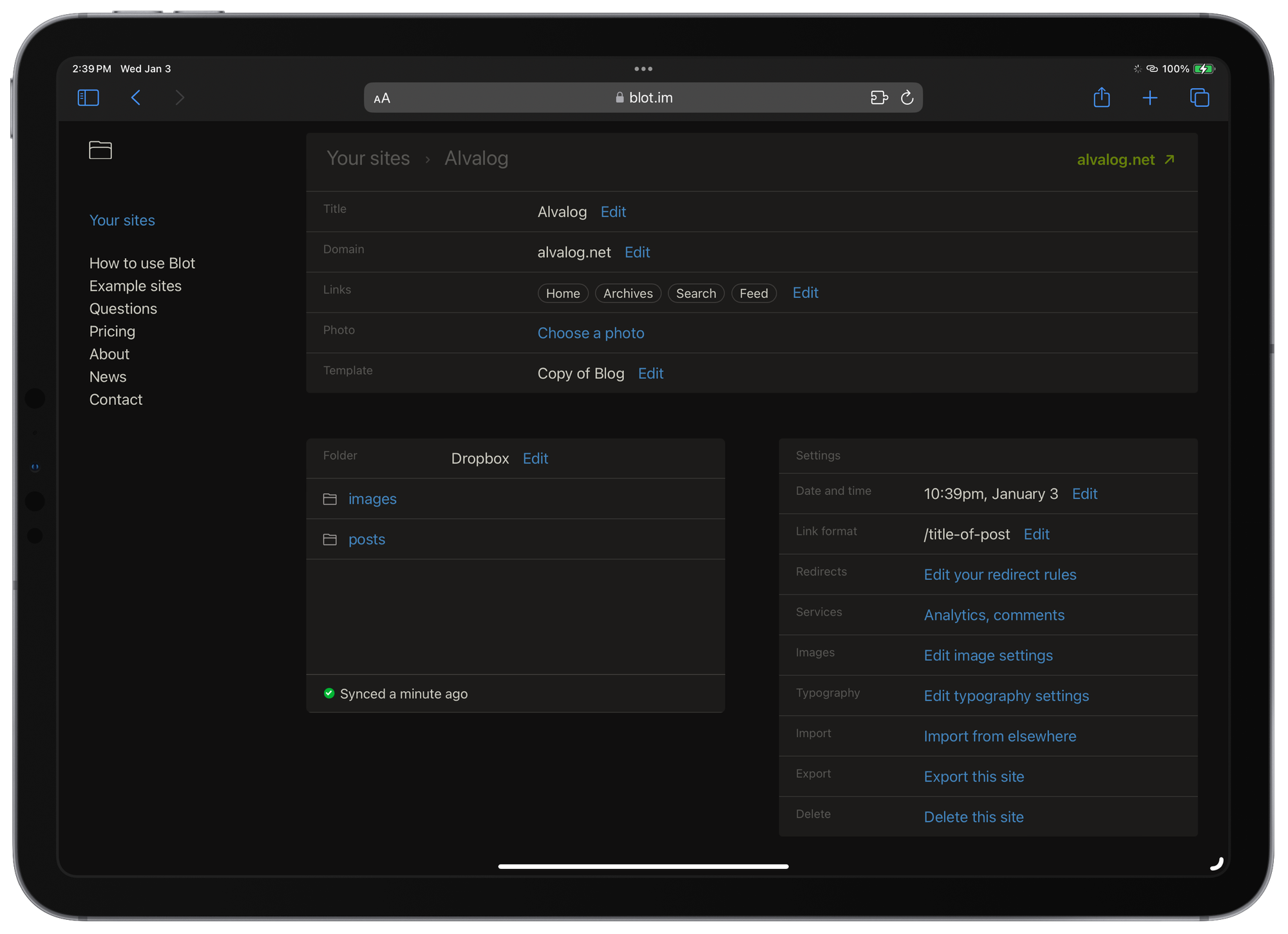 For my more personal and, for lack of a better term, simple blog, I wanted something more mobile. Alvalog is where I plan to post quick thoughts that you would normally see on social media, a place just for me. I like Blot.im, where Alvalog resides, and the simplicity of uploading photos and Markdown files to a folder in Dropbox to post is really great.