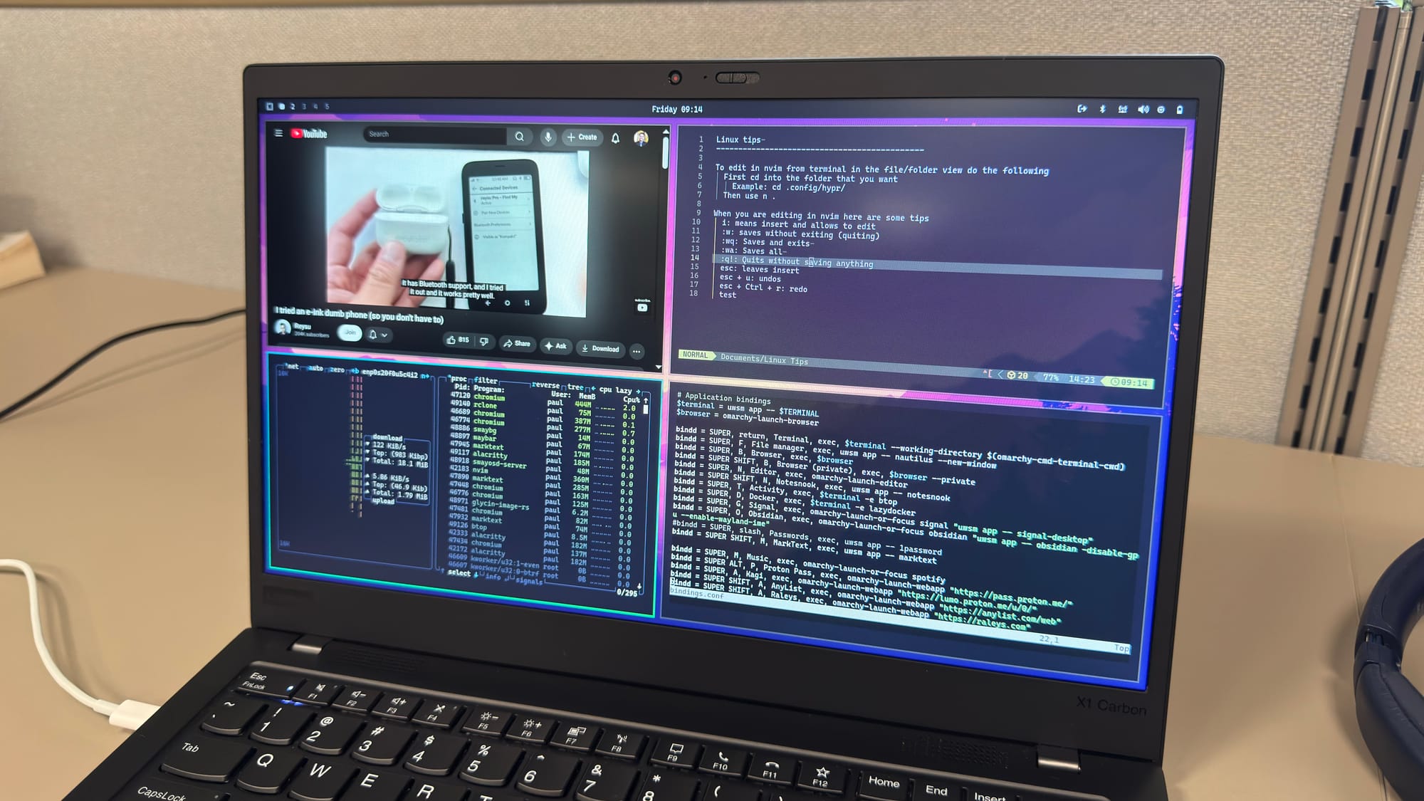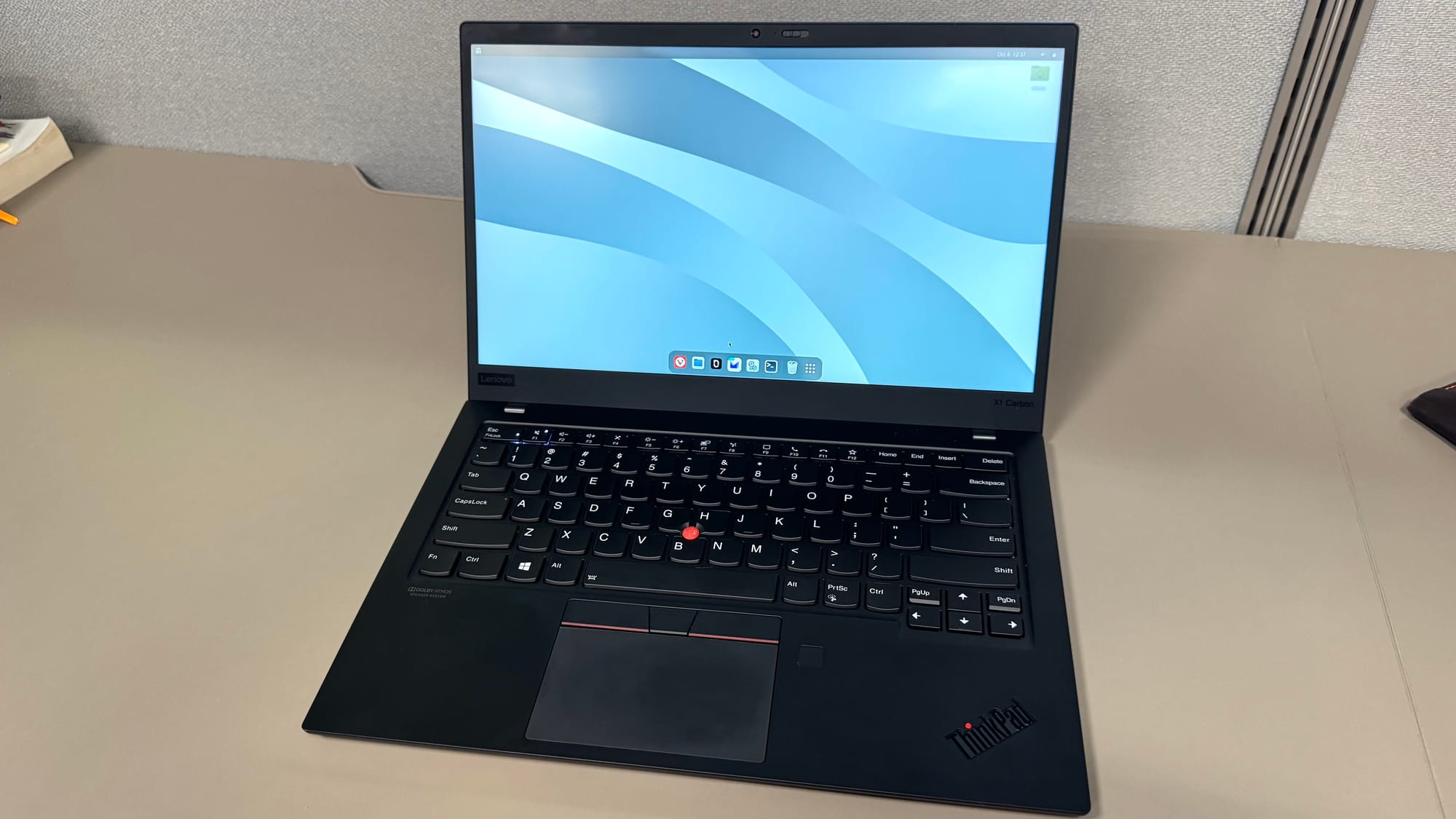 The carbon fiber and aluminum body of this laptop feels super light and premium — it almost feels like plastic, it’s so lightweight. The screen, even though only FHD (1920 × 1080), looks great and crisp for a 14-inch display. I also really like the IPS panel and anti-glare matte screen, which gives it a more business look. It’s great in all lighting situations, and with Linux installed, everything looks sharp.