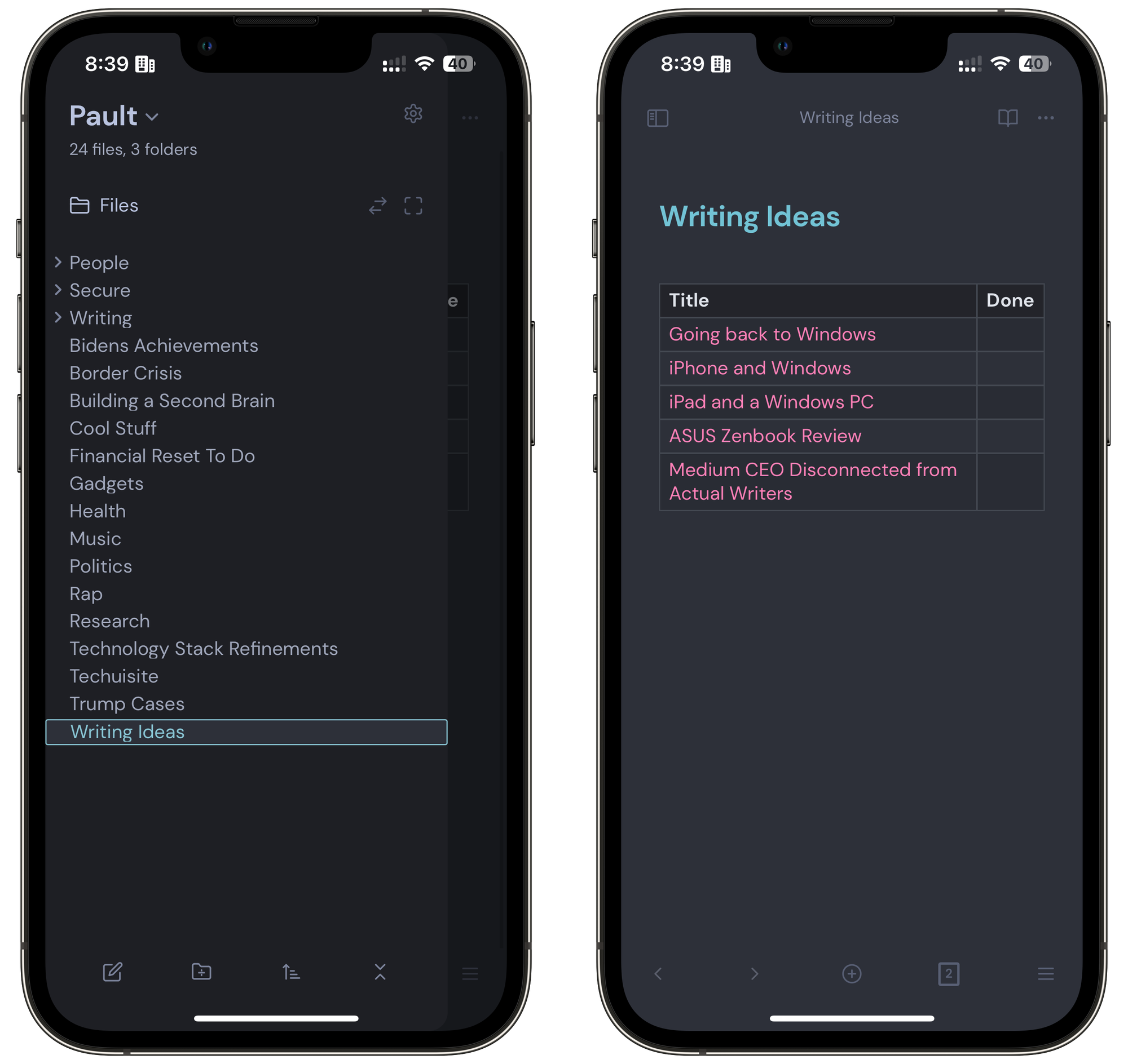 Obsidian is a great app. And the cost of using Obsidian Sync is well worth it with my setup. Since Obsidian requires that you use iCloud on the iPhone, and since I now am managing two separate Apple IDs or iCloud accounts, using iCloud just doesn't work for me if I want to access Obsidian on my iPhone, iPad, and Windows.